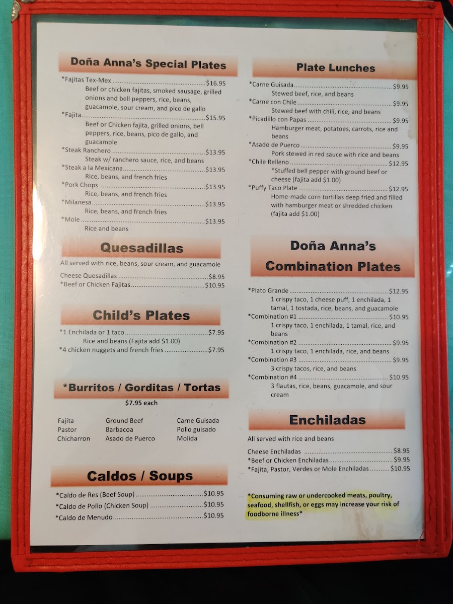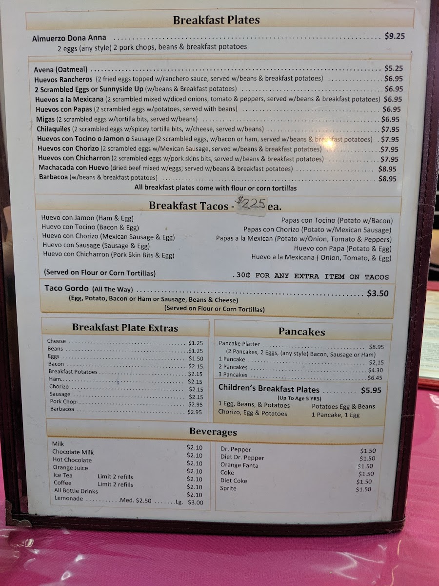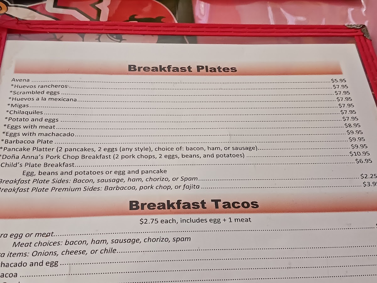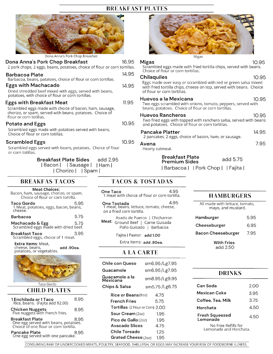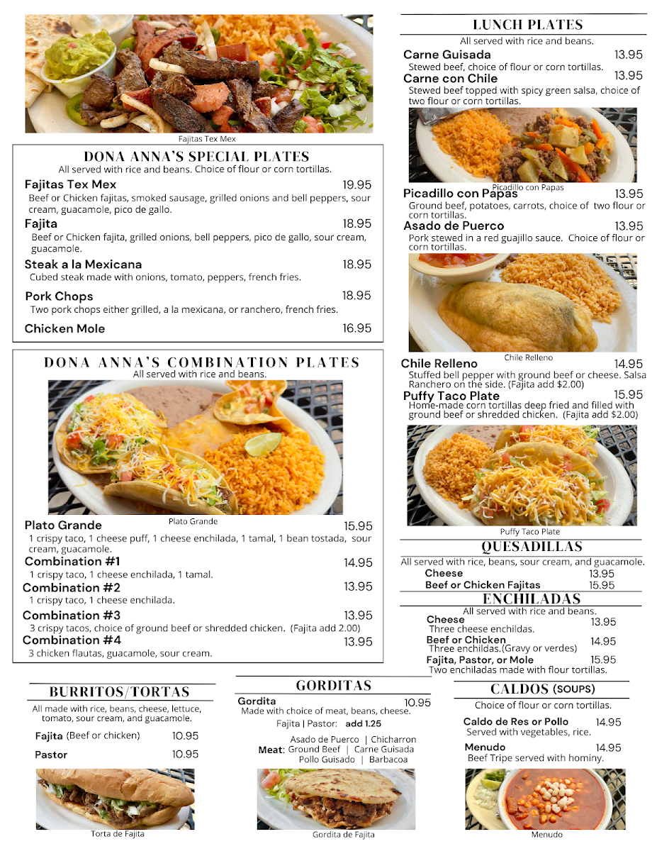 The menu is a celebration of classic Mexican breakfast dishes that are crafted with care and skill. Start your day with one of their Breakfast Plates, such as the Doña Anna's Pork Chop Breakfast, a satisfying ensemble featuring two perfectly cooked pork chops served alongside eggs, beans, and potatoes, all wrapped in your choice of flour or corn tortillas for just $16.95. For a taste of home, the Eggs with Machacado combines dried shredded beef with fluffy eggs, harmonizing beautifully with beans and potatoes for just $14.95. And for those who prefer a lighter bite, their delightful Child Plates offer options like a single enchilada or taco with rice and beans starting at $8.95.