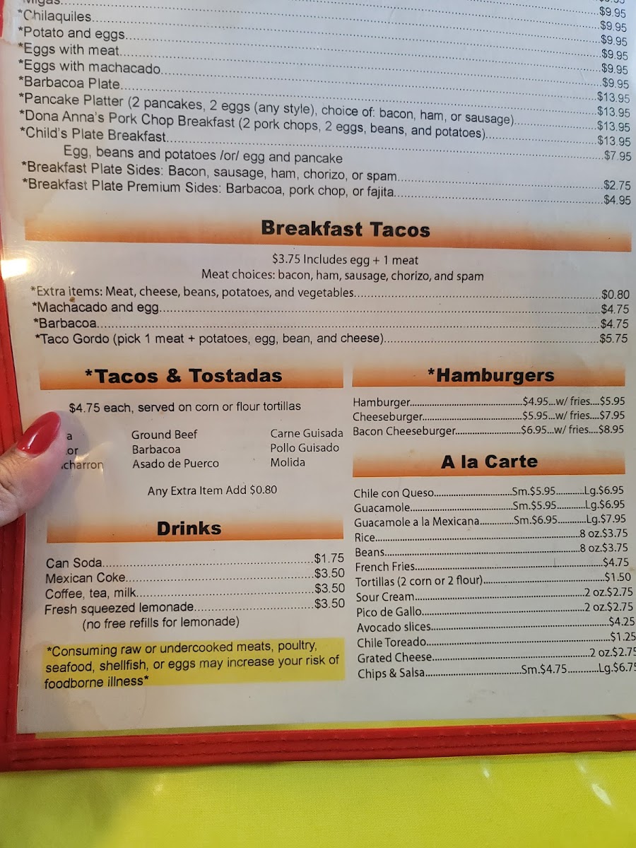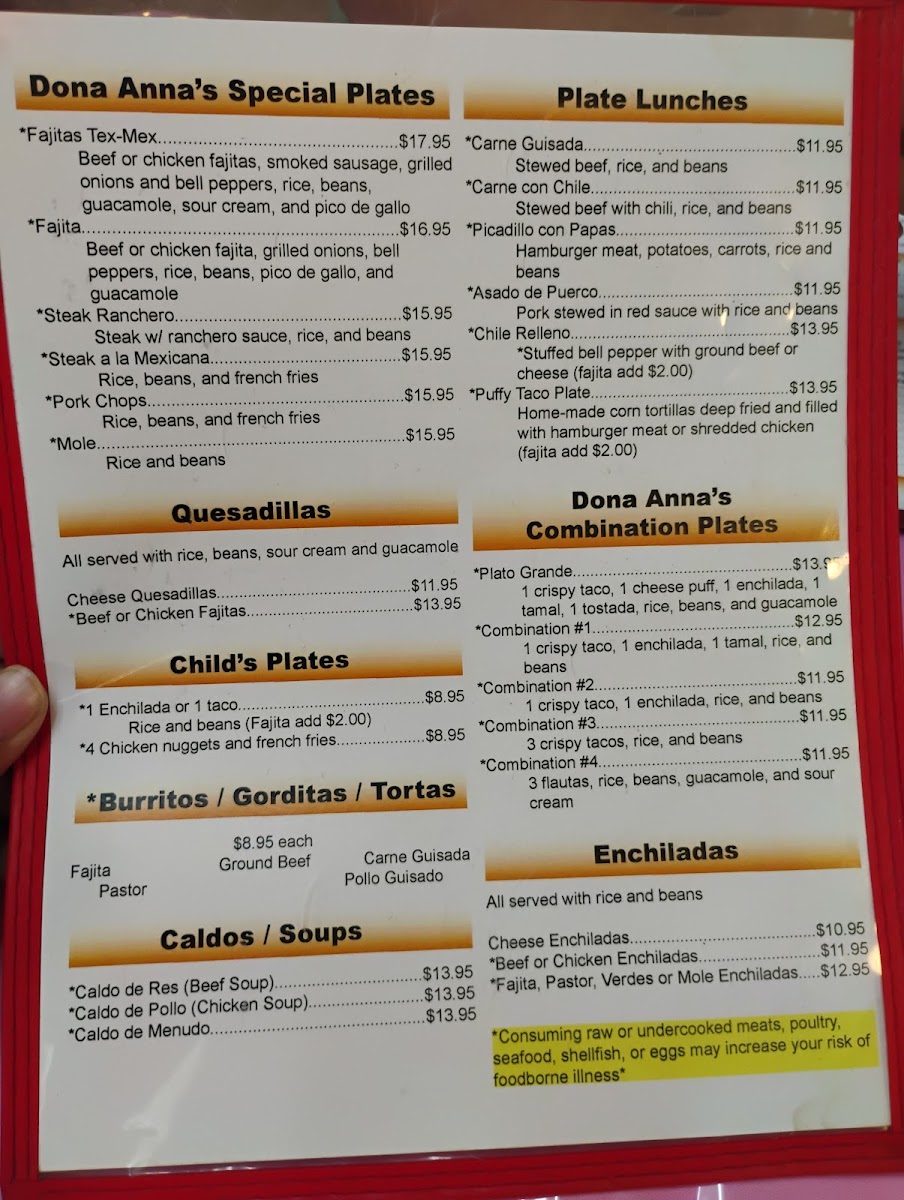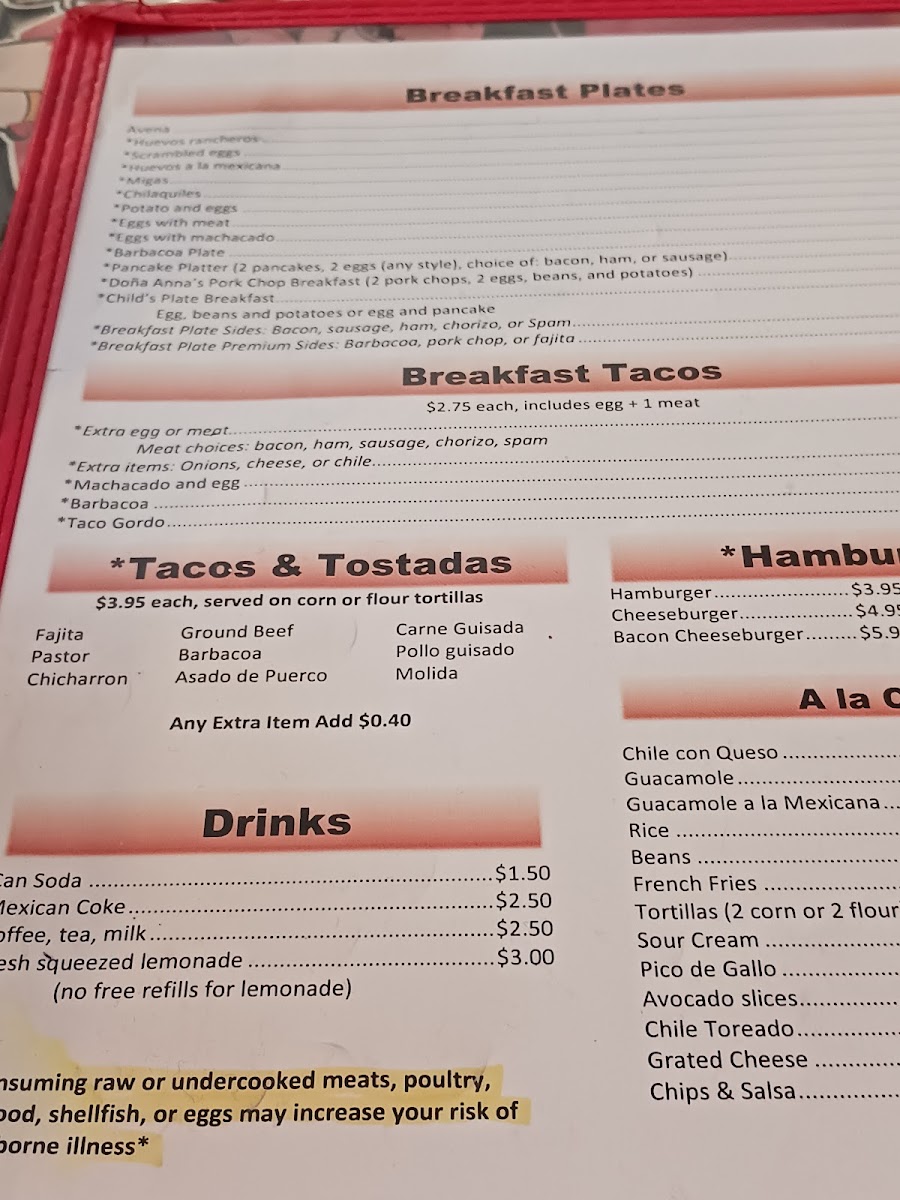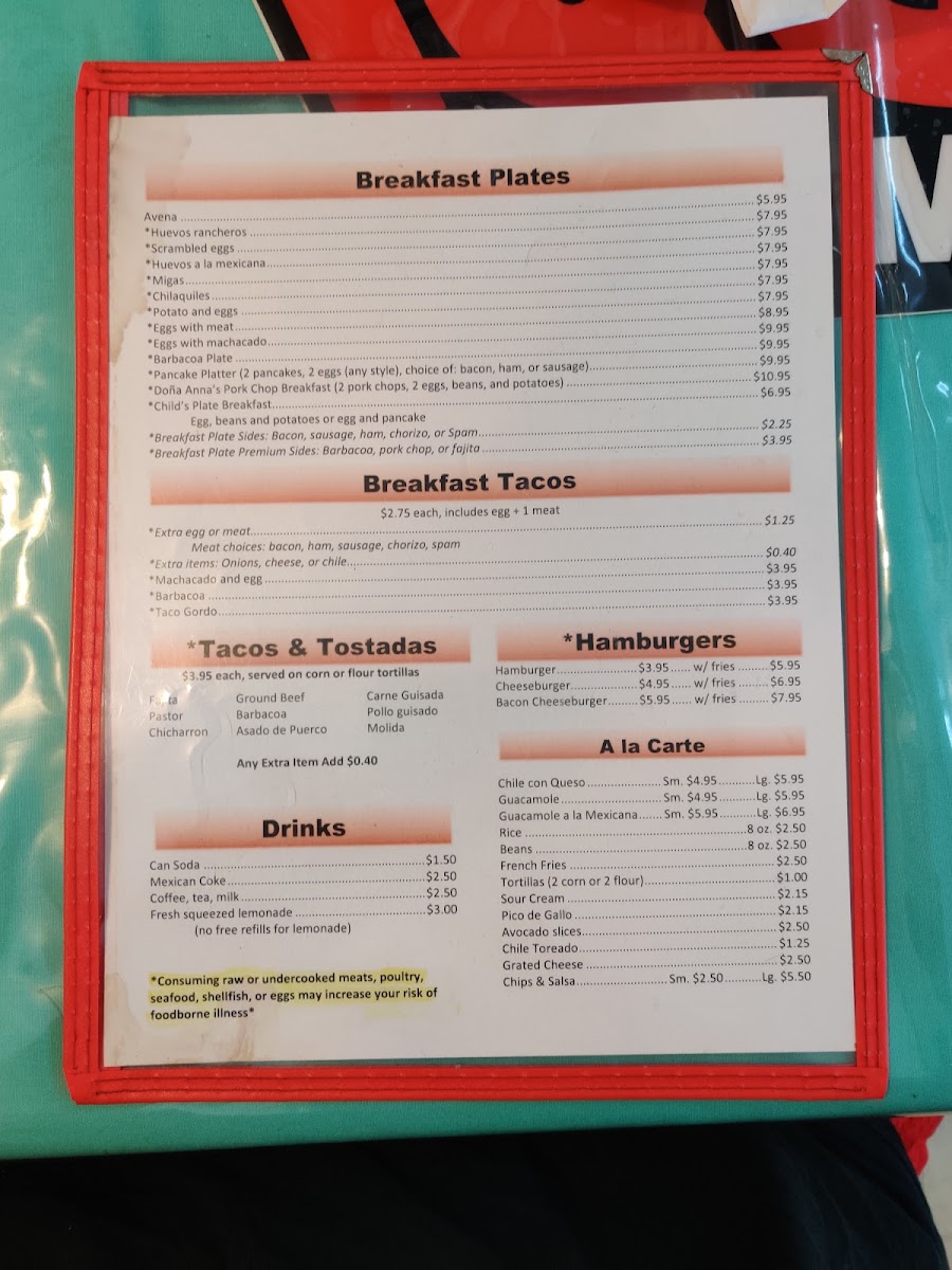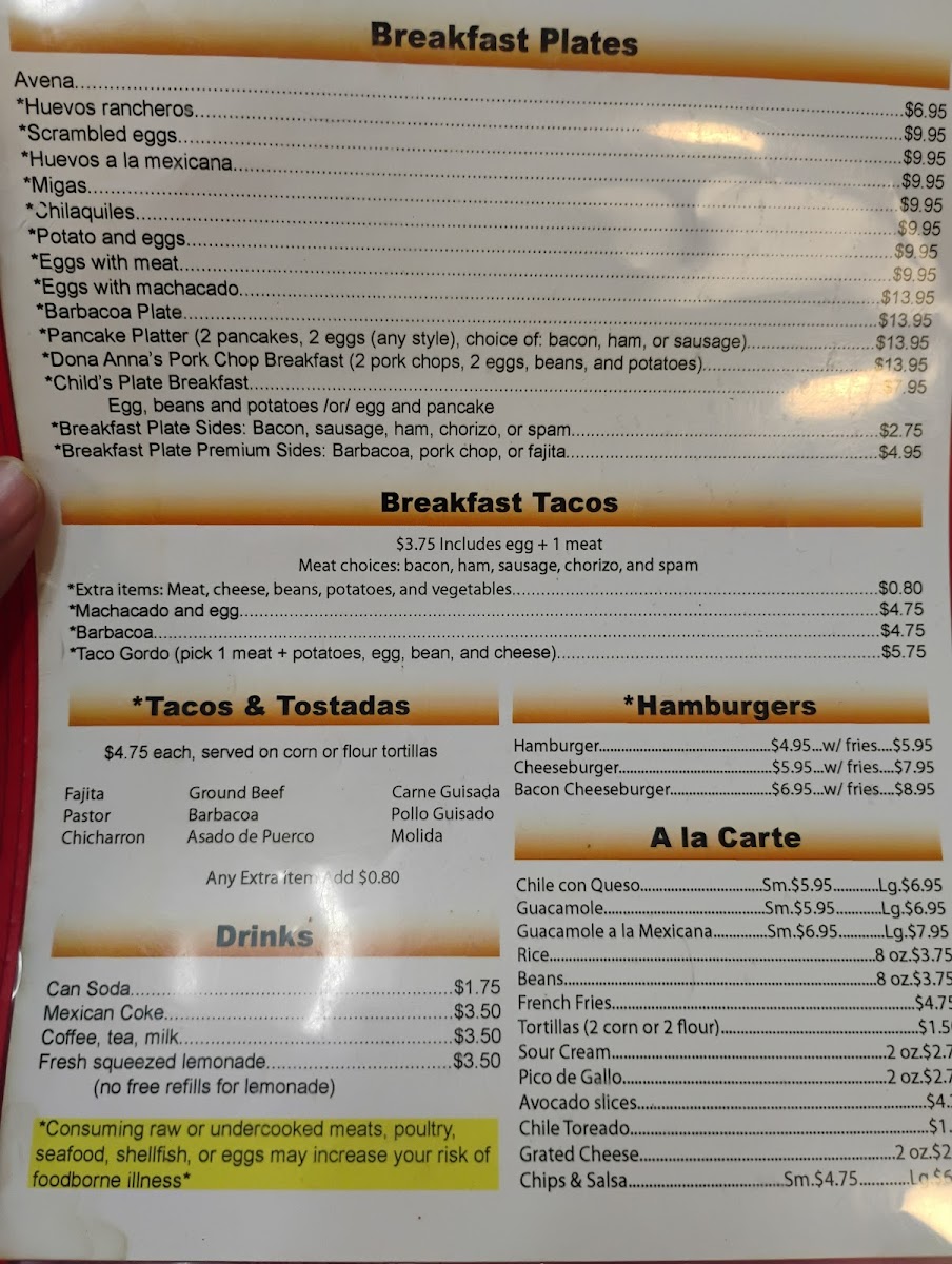 The menu is a celebration of classic Mexican breakfast dishes that are crafted with care and skill. Start your day with one of their Breakfast Plates, such as the Doña Anna's Pork Chop Breakfast, a satisfying ensemble featuring two perfectly cooked pork chops served alongside eggs, beans, and potatoes, all wrapped in your choice of flour or corn tortillas for just $16.95. For a taste of home, the Eggs with Machacado combines dried shredded beef with fluffy eggs, harmonizing beautifully with beans and potatoes for just $14.95. And for those who prefer a lighter bite, their delightful Child Plates offer options like a single enchilada or taco with rice and beans starting at $8.95.